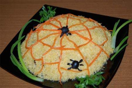 Для такого украшения потребуются консервированные оливки или же маслины, кусочки сыра сулугуни и продолговатые ломтики корейской моркови. Оформить салат совсем несложно, сначала сделайте паутинку, затем посадите на ней паучков.