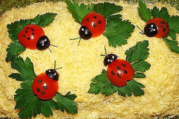 Для такого украшения перережьте пополам помидоры черри, сделайте головы из маслин, усики из стебельков петрушки или укропа, не забудьте о черных капельках на панцыре.