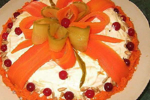 Оформите салат в виде подарочного торта с помощью ломтиков огурцов и мокови, также можно украсить клюквой и другими подходящими ягодами. Также сделайте небольшой цветок из овощей и скрепите зубочистками, цветок положите в центре салата-торта, потом извлеките из него зубочистки.
