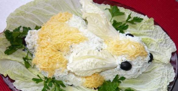 Выложите салат на блюдо в форме кролика, сверху посыпьте тертым сыром и сделайте ушки из листиков пекинской капусты, а глазки из маслин. Такой салат вызовет большой восторг у детей, да и взрослым он понравится.