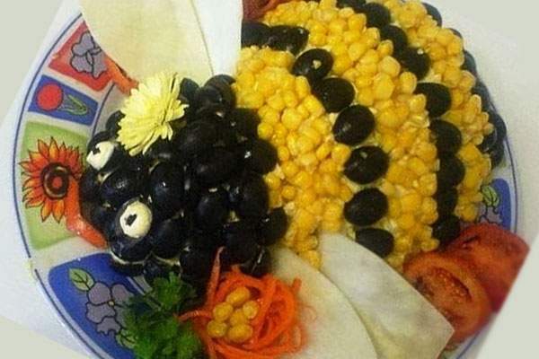 Такой салат сделать очень легко. Выложите салат в форме пчелки на блюдо, а затем украсьте его половинками маслин и консервированной кукурузой, сделай таким образом яркую пчелиную расцветку.