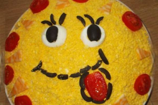 Такой салат сразу поднимет настроение детям. Посыпьте салат тертым желтком, сделайте глазки с белков и маслин, а улыбочку из помидоров.