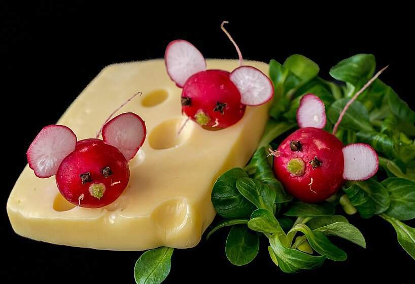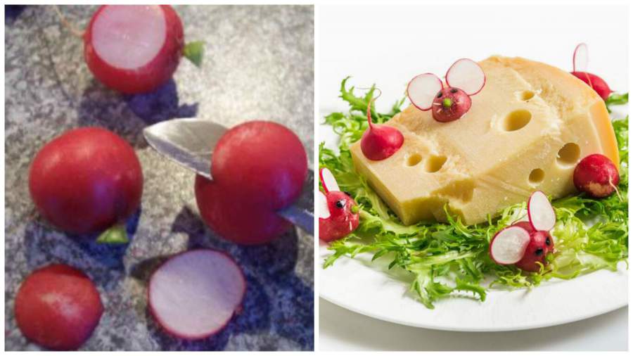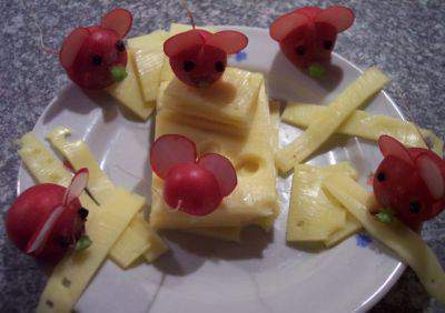 6. Мышки из редисок готовы. Осталось разместить их в качестве украшения на салат, сырную нарезку или другую композицию из ветчины, сыра, овощей и зелени.