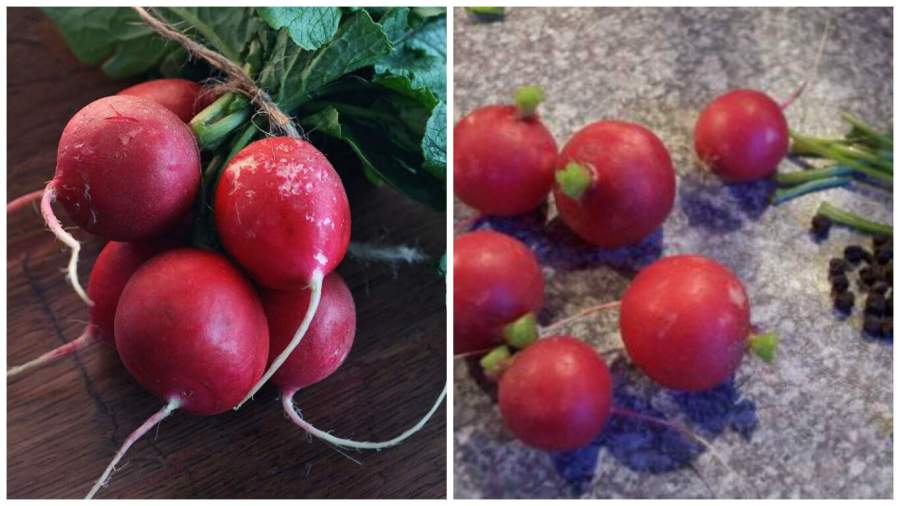 1. Для изготовления трех мышек подберите 6 редисок с длинными тонкими хвостиками, желательно, без особых внешних повреждений. Тщательно вымойте исходный материал и обрежьте розетки листьев, оставив у трех редисок только короткое основание зеленого стебля (хохолок), которое будет изображать носик.