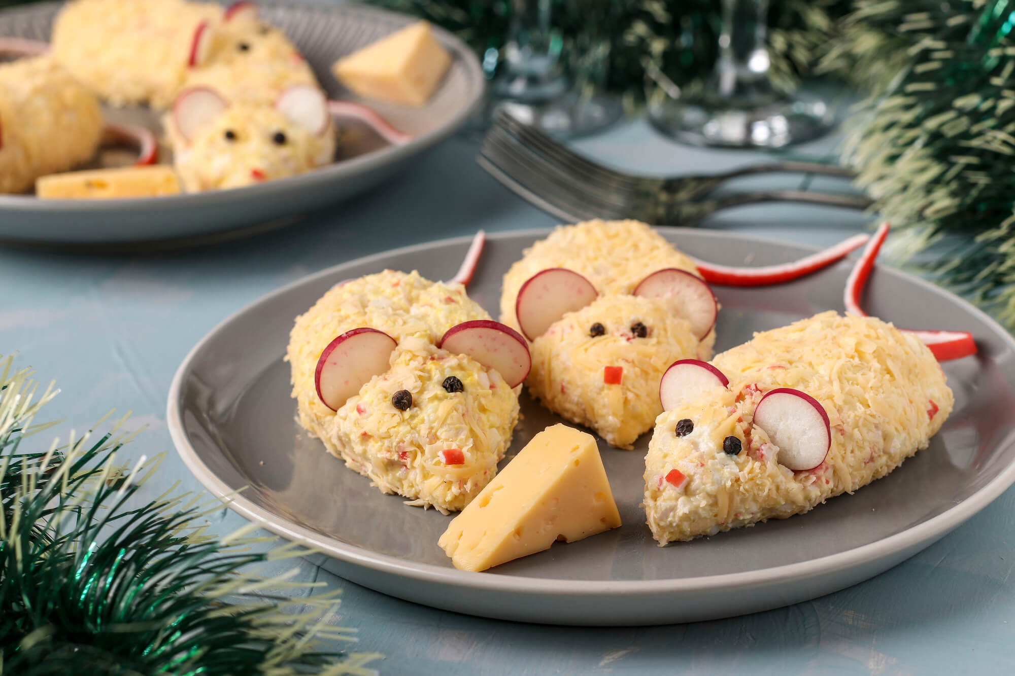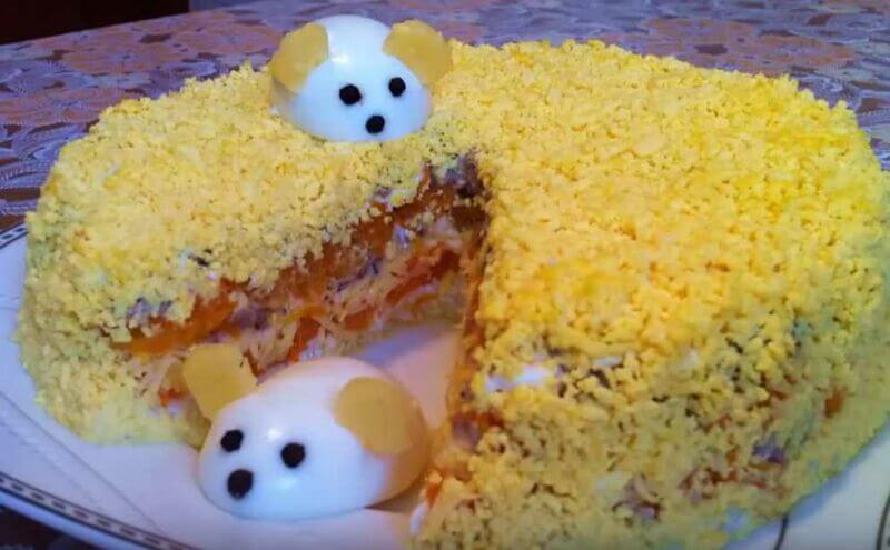 Салат, приготовленный в любом составе ингредиентов, выложенный слоями или общей массой, преобразится, если вы добавите фигурки мышат, придавая блюду ту или иную композицию. Как правило, таких мышат изготовляют из куриных или перепелиных яиц. Но возможны и другие варианты – из редисок или даже тушек кальмаров, наполненных салатной массой.