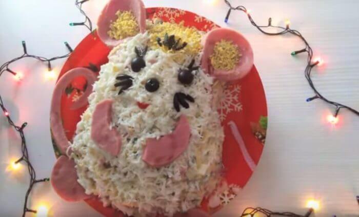 Приближение Нового 2020 года приводит к мысли о составлении праздничного меню застолья, важной составной частью которого являются салаты. По восточному календарю этот год с конца января будет находиться под знаком Белой Крысы или Мыши, поэтому оформление салатов желательно выполнять соответственно.