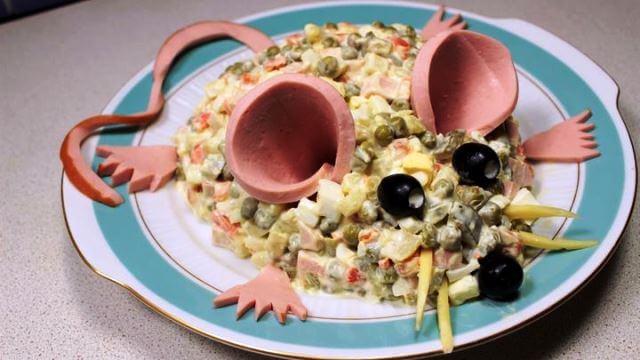 Украшение салатов в образе Крысы или Мыши выполнить не сложно. Известно три направления, в которые следует направить свою творческую фантазию: украшение салата фигурками мышат, придание салату очертаний символического зверька, создание из салатной массы одной или несколько фигурок крысы (мыши).