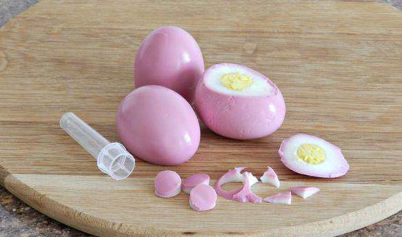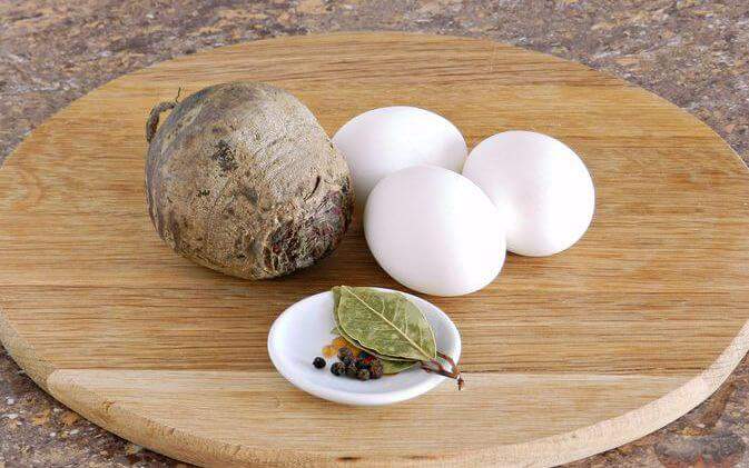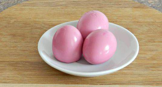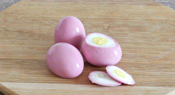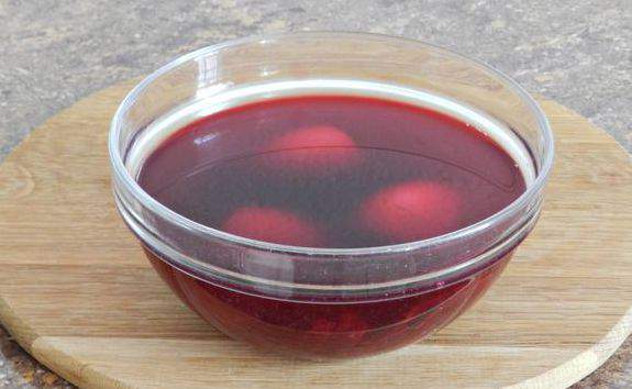 5. Залейте кубики свёклы кипятком. Опустите в миску очищенные яйца и оставьте минут на 20-30, периодически переворачивая ложкой или шумовкой, проверяя степень окрашивания. Чем дольше будете держать яйца в свекольной воде, тем интенсивнее получите цвет.