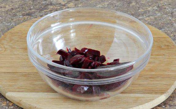 4. Отваренную и очищенную свёклу нарежьте кубиками и сложите в глубокую миску.