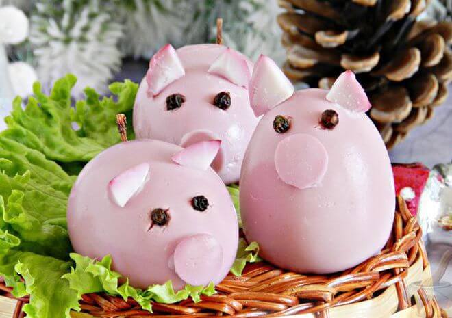 9. Вставьте «глаза» поросятам, использовав для этой цели черный перец. Чтобы горошины не выпадали, проделайте небольшие отверстия острием ножа и воткните «глаза» в них. «Пятачки» прикрепите с помощью небольшого количества майонеза.