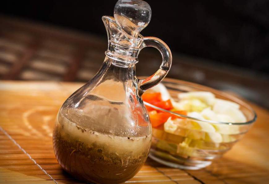 4. Заправка с яблочным уксусом и сухими травами готова к употреблению. Сдобрите ею ваш салат, а остальную перелейте в красивый графинчик и подайте вместе с салатом на стол.