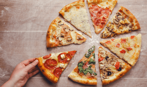 Пицца "Четыре сезона": ре общей инредиент - помидоры. Пицца разделена на четыре части: весна (оливки и артишоки), лето (солями и черный перец), осень (моцарелла), зима (грибы и вареные яйца).