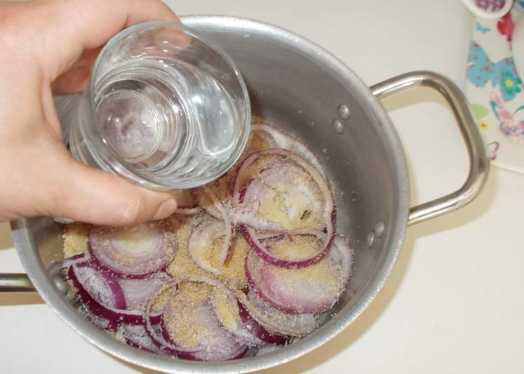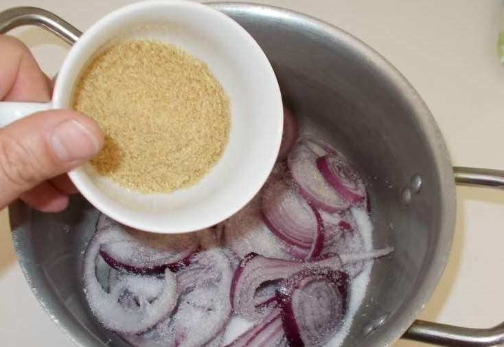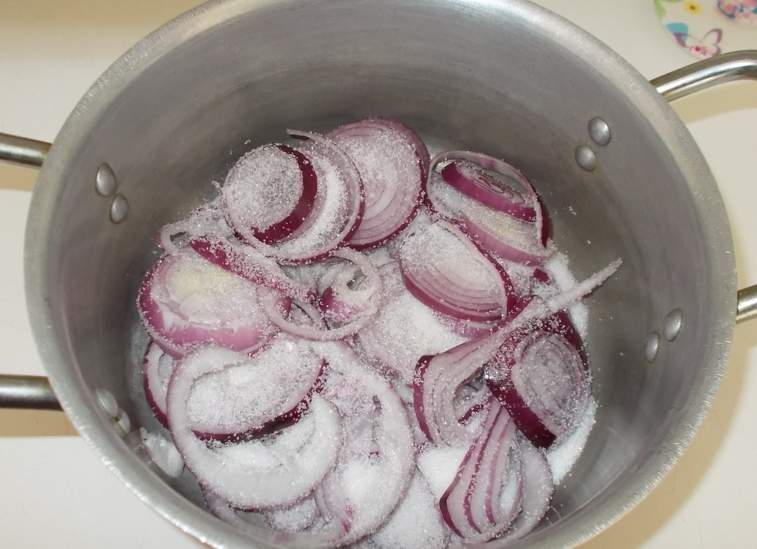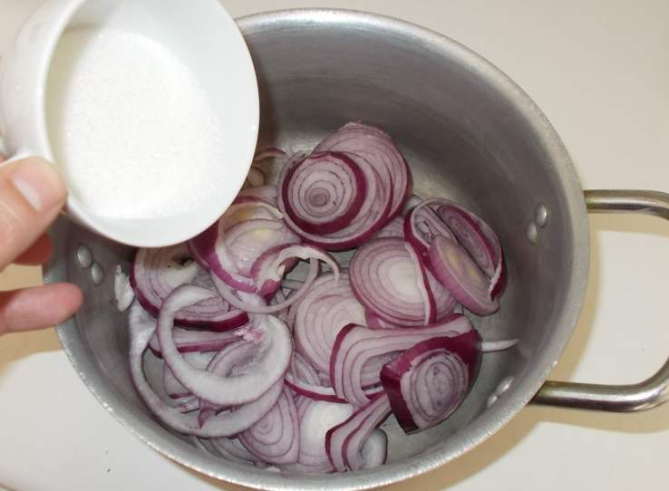 6.Засыпьте белым сахаром кольца лука в кастрюле.