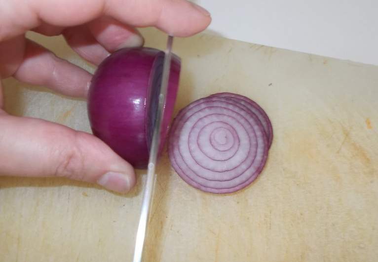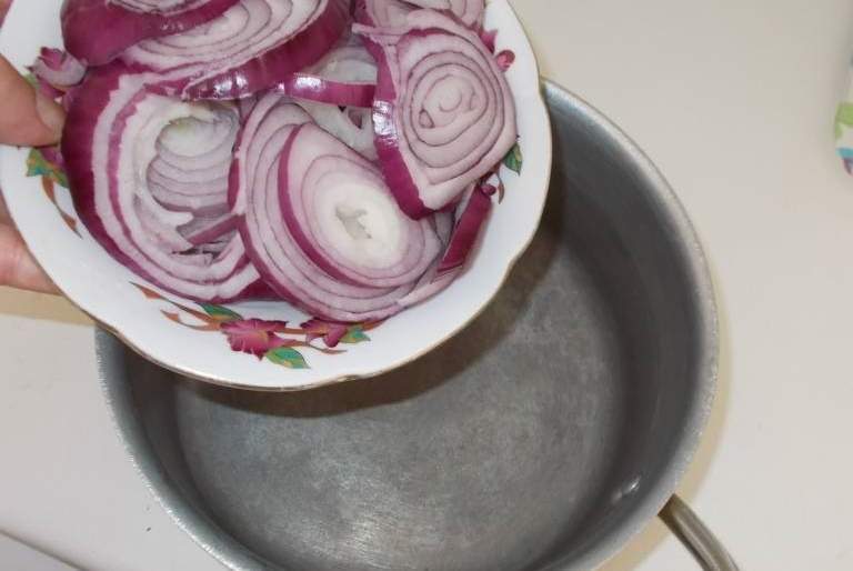 2. Нарежьте лук не слишком тонкими колечками.