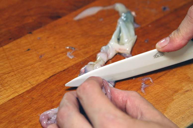 Щупальца должны быть отделены от головы острым ножом за один прием. Голову и внутренности выбросьте. Можете оставить разве что мешок с чернилами, если этого требует рецепт приготовления.