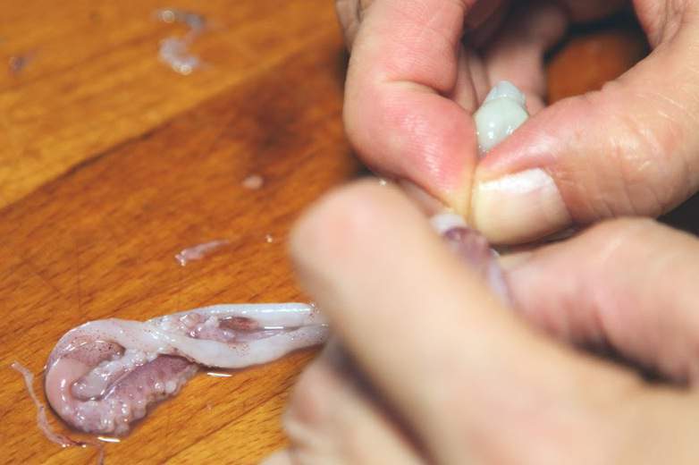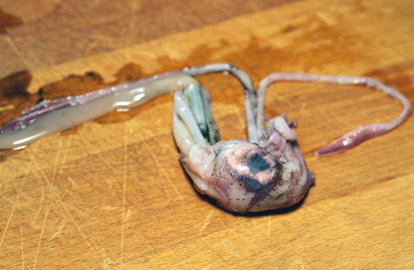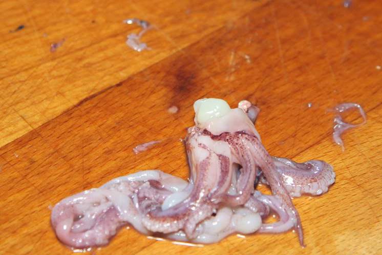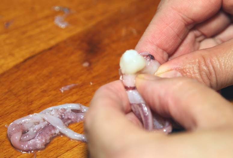 На щупальцах имеется еще подлежащий удалению «клюв». Это похожий на зуб рот кальмара. Его иногда так и называют – «зубом». Находится «клюв» внутри мясистого ободка, соединяющего основания щупалец.