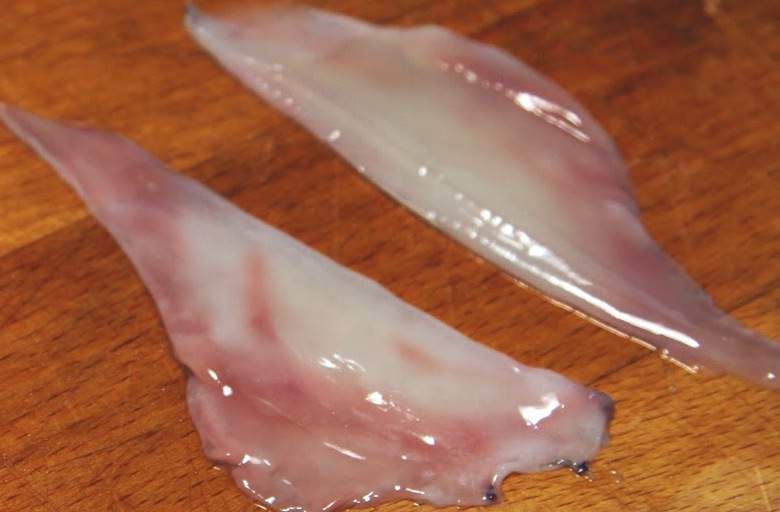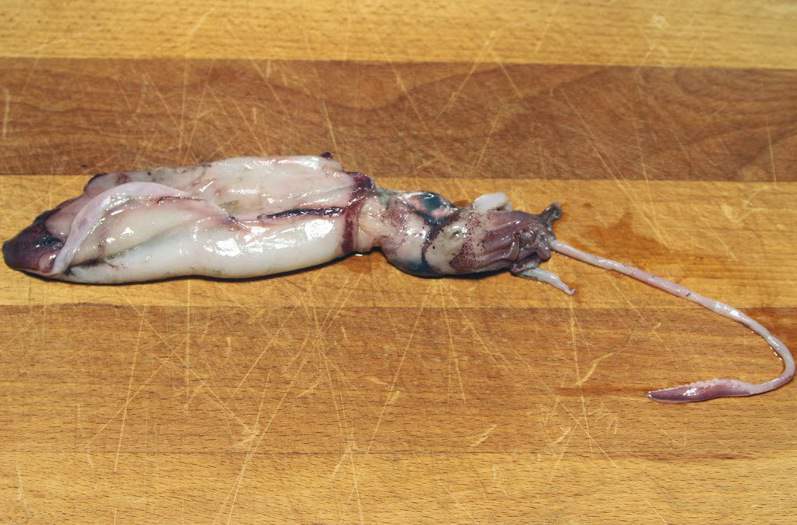 Внутри тела кальмара вы легко нащупаете хитиновую пластинку, которая легко удаляется.
