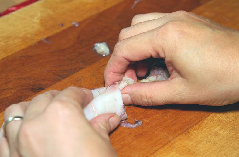 В завершение очистки тела (мантии) удалите плавники. Если вы будете использовать их в пищу, отложите пока в сторону.