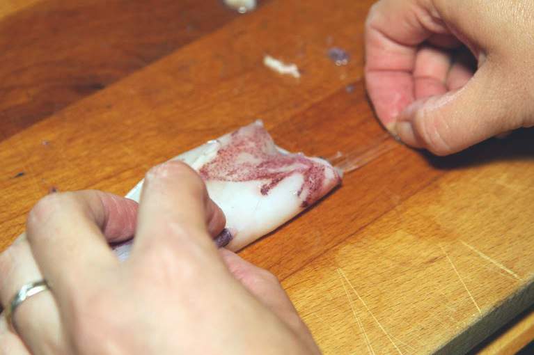 У свежих кальмаров пленки легко сходят за один прием. Замороженных моллюсков можно ошпарить кипятком и сразу слить воду. Пленки кожицы свернутся, и вы их легко удалите.