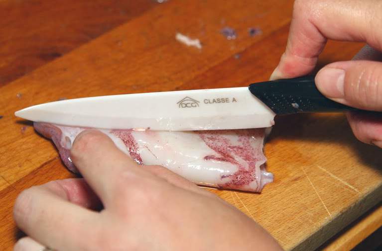 Теперь вас ожидает процедура удаления кожных пленок – цветной и прозрачной. Слегка надрезая ножом, у вас легко получится снять цветную пленку. Но будьте осторожны, чтобы глубоко не порезать тело кальмара, наделав в нем дыр. Ведь часто целостность тушки важна, например, для фарширования.