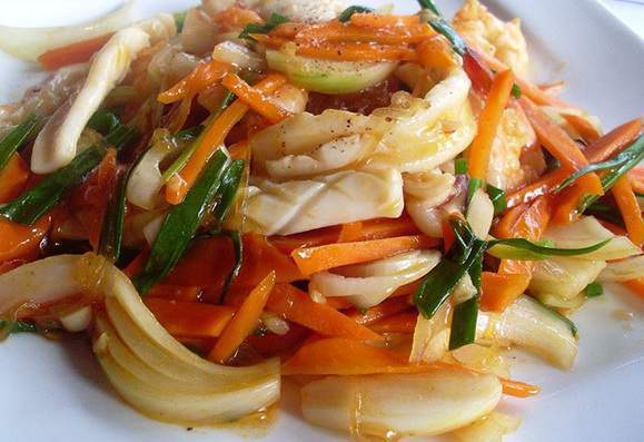 В некоторых рецептах салатов используется тушеные с овощами кальмары. При тушении кальмара вы должны помнить, что поддавать его длительной термической обработке ни в коем случае нельзя. Поэтому сначала обжарьте овощи (лук, морковь, чеснок и другие), доведя их до готовности и лишь в самом конце, за 3-5 минут до окончания, добавьте мясо кальмаров.
