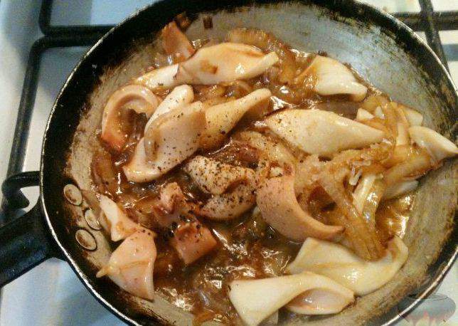 Тушите кальмаров на минимальном огне под закрытой крышкой. Несоблюдение этих правил приведет к резиновому результату.