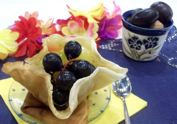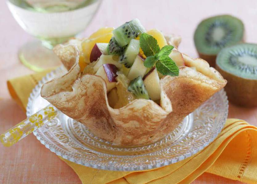 7. После остывания можете наполнить блинные корзинки любой начинкой – сладкой или не сладкой. Как вариант, это может быть салат. Помните, что не следует укладывать в блинные корзинки слишком влажный салат, чтобы «посуда» не раскисла.