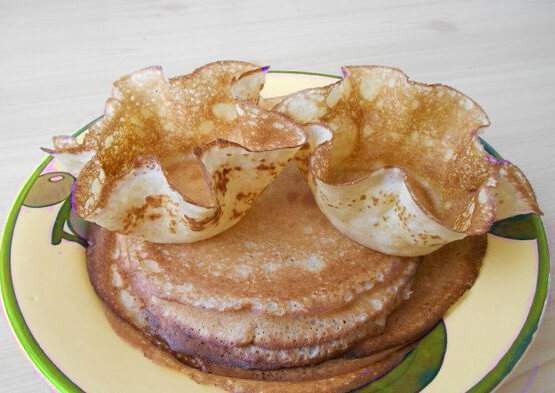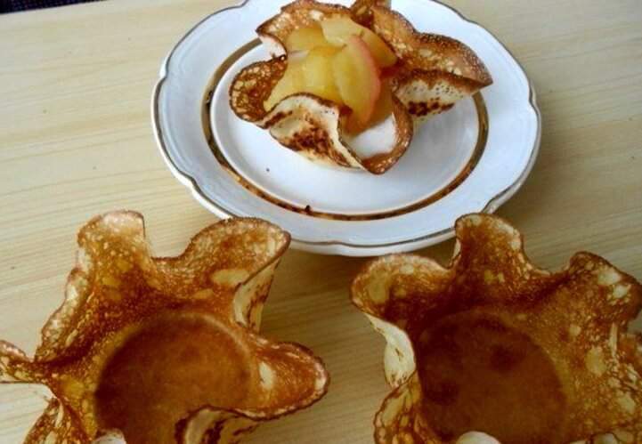Блинные корзинки, как альтернативу покупным тарталеткам, можно изготовить в духовке или микроволновой печи. Рассмотрим второй вариант. Исходный «материал» для корзинок – конечно же, блины, которые можно пожарить на сковороде по любому известному вам рецепту. Предлагаем один из таких рецептов.