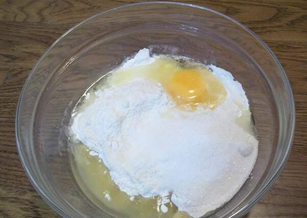 1. В глубокую миску или другую подходящую емкость насыпьте муку, разбейте яйцо, влейте растительное масло, добавьте сахар и соль.