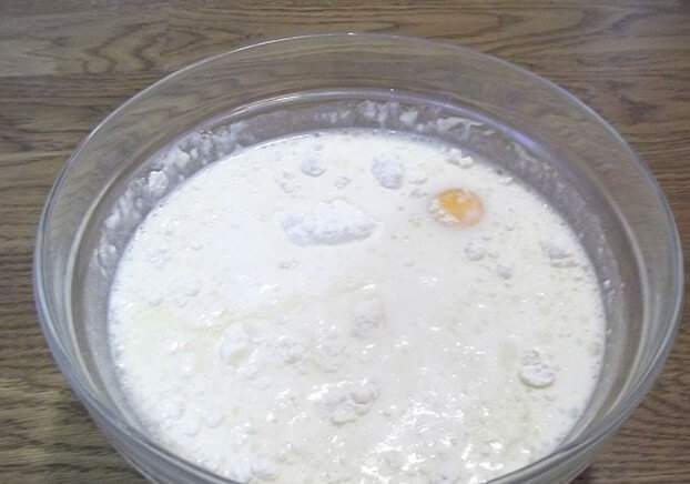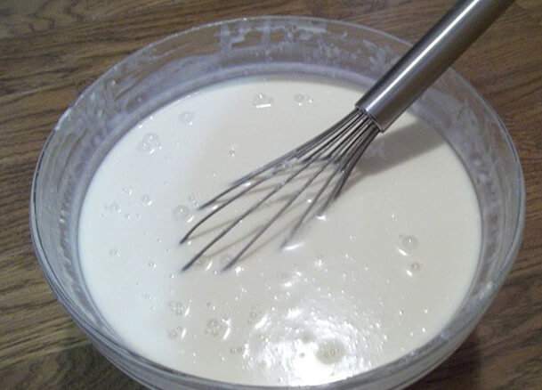 3. Полученную мучную массу вымешайте и взбейте до однородной консистенции жидкой сметаны при помощи блендера или венчика.