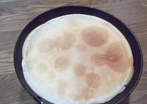 4. Нагрейте сковороду, смажьте ее кусочком сала, наколотым на вилку. Зачерпните половником порцию жидкого теста, налейте на сковороду тесто. Наклоняйте сковороду круговыми движениями в разные стороны, чтобы тесто равномерно растеклось. Жарьте каждый блинчик до золотистого цвета около 2 минут с каждой сковороды. До какой степени зарумянить блинчики для корзинок, решать вам.