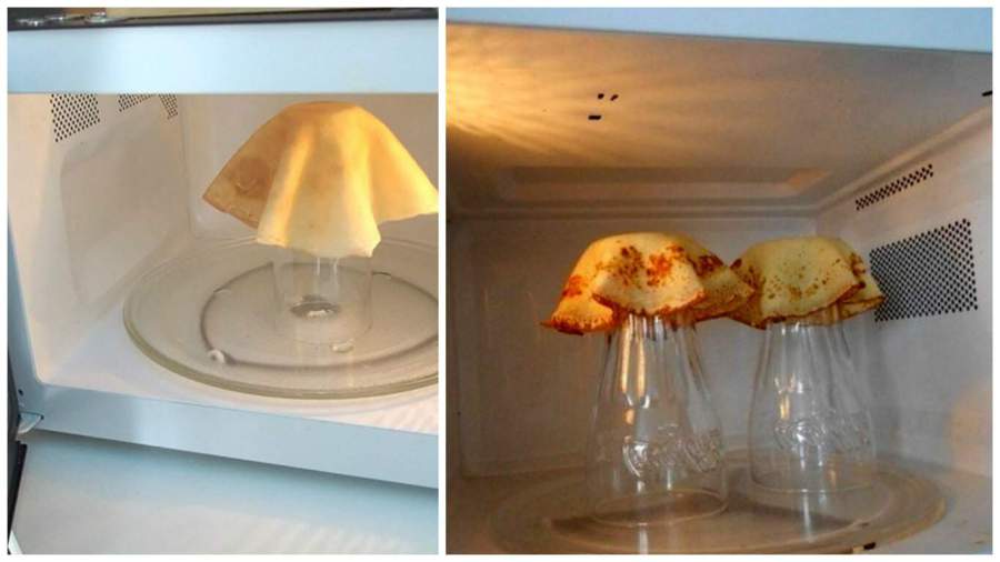 5. Когда пожарите все блины, пора приступать к изготовлению корзинок. Для этого вам следует подобрать посуду желаемого размера и формы. Это могут быть глубокие миски, горшочки, стаканы, фужеры или другие емкости, которые допустимо ставить в микроволновку. От выбора «тары» будет зависеть размер и форма ваших корзинок. Выбранную посуду переверните вверх дном, уложите на нее блин и поставьте в микроволновую печь на 1-5 минут. Время выпечки будет зависеть от мощности печи.