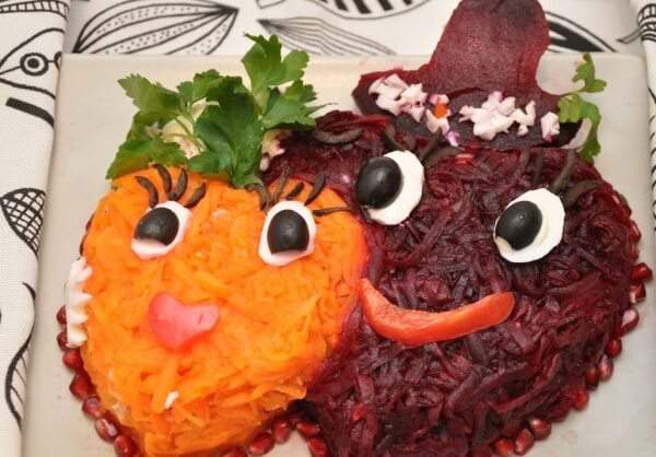 9. Напоследок укрась те салат. Очистите яйца, аккуратно отделите белки. Сделайте сердечкам глаза из белков и маслин. Украсьте салат веточками петрушки и сделайте рожицы с кусочка свеклы или перца.