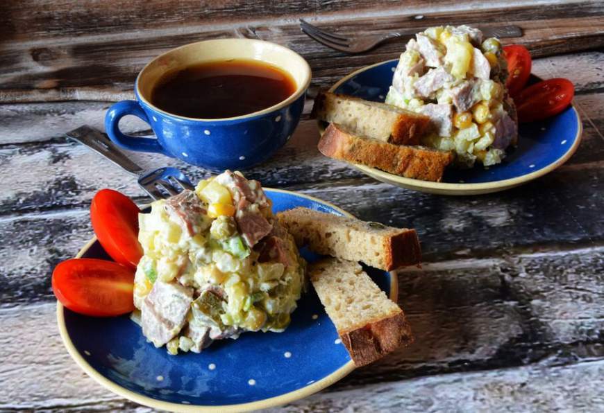 • Картофель для салата вы можете отварить и в кожуре, а затем охладить, очистить и нарезать кусочками. Но имейте в виду, что его нужно будет слегка присолить после нарезания до смешивания в салате, чтобы блюдо в результате не получилось слишком пресным.