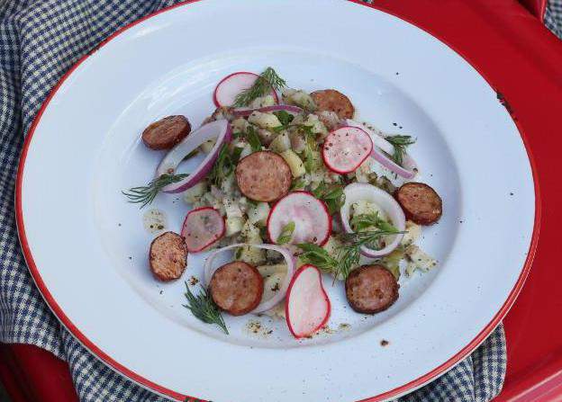 8. Украсьте салат колбасками, редиской и укропом, сверху поперчите. Салат из картофеля с колбасками и беконом готов к употреблению.