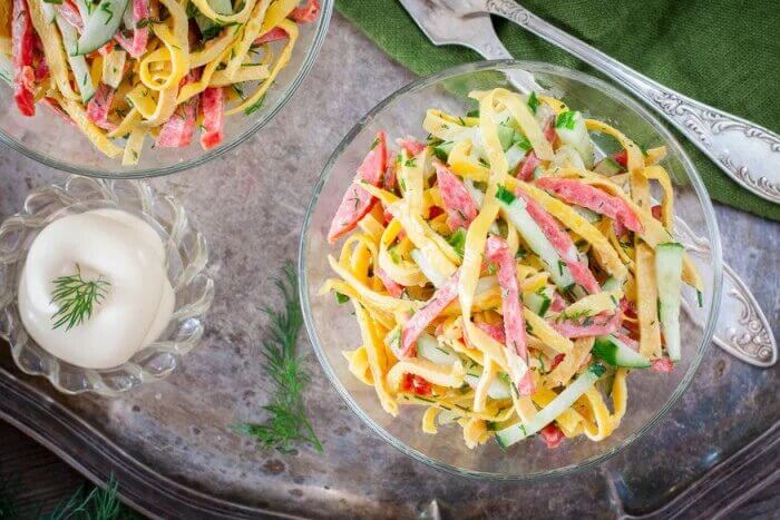 7.Салат из яичных блинов с салями и огурцами готов. Подавайте его к столу немедленно. Во избежание размокания блинного ингредиента, заправлять салат следует именно перед подачей на стол.