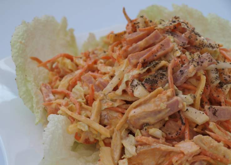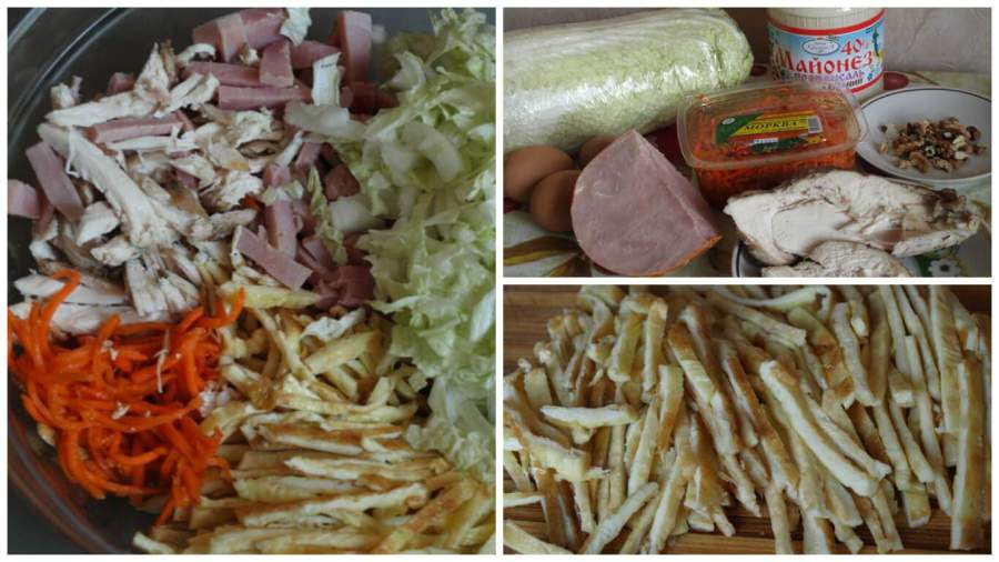 5. В глубокой вместительной миске соедините нарезанное куриное мясо с ветчиной, пекинской капустой, корейской морковью, блинчиками и грецкими орехами. Тщательно перемешайте. Попробуйте и, в случае необходимости, досолите и поперчите. Но имейте в виду, что корейская морковь и майонез могут иметь в своем составе достаточное количество соли и специй.
