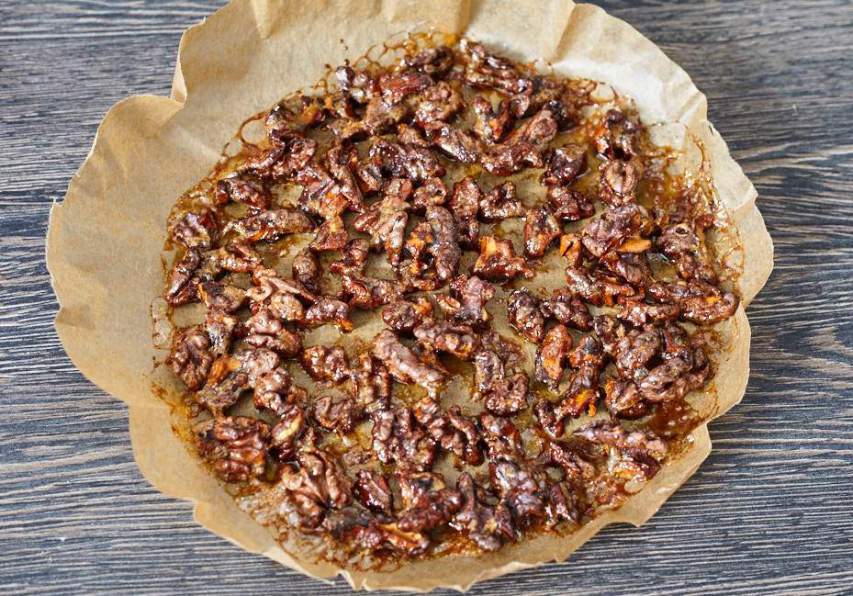 2. Небольшой противень или сковороду застелите бумагой для выпечки, выложите орехи с медом и отправьте в духовку, разогретую до 180 градусов, на 15-20 минут до приобретения коричневого цвета. Готовые карамелизованные орехи выньте из духовки и оставьте остывать.