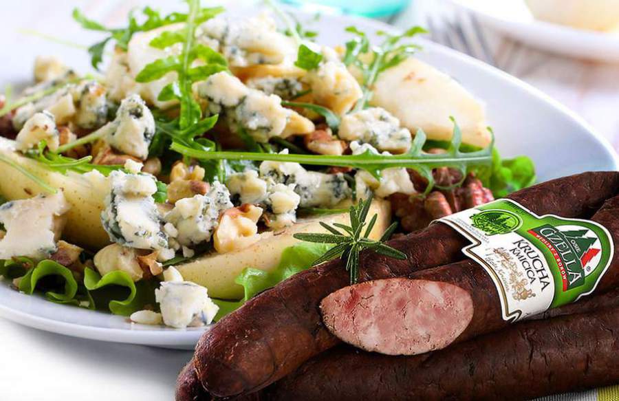 7. Салат с колбасой и карамелизованными орехами можно подавать в теплом и холодном виде.