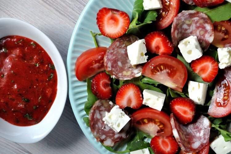Готовим салат с колбасой и клубникой под клубничным соусом