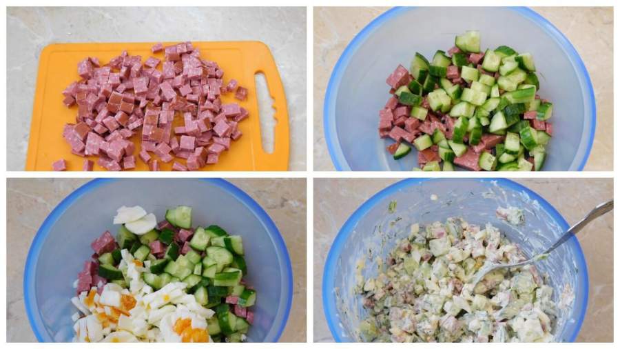 3.Подготовленные огурцы нарежьте аналогичными с колбасой кубиками и добавьте в миску.