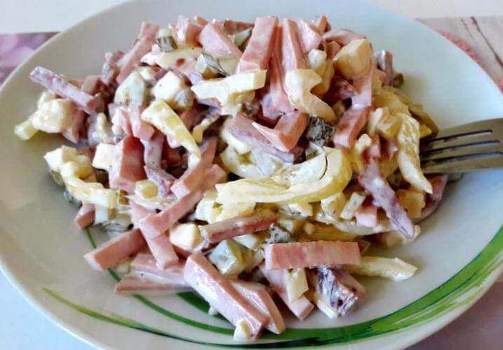 • Вместо полукопченой колбасы можно использовать в салате копченую курятину или даже мясо из бульона.