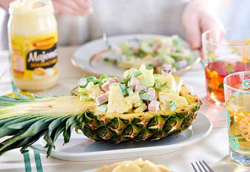 6. Экзотический салат с ананасом, ветчиной и сельдереем готов к подаче на стол.