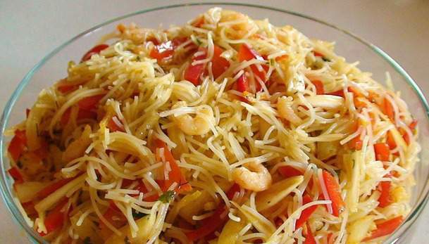 1. Сначала отварите лапшу для вашего салата в подсоленной воде. Когда лапша сварится, сцедите воду, промойте и охладите лапшу.