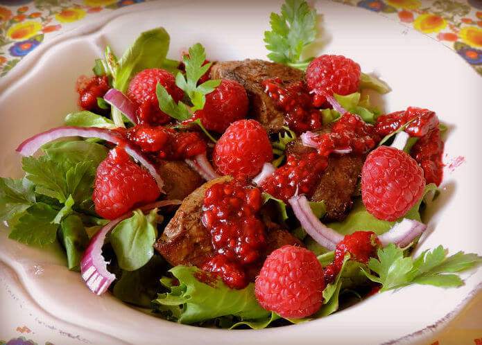 7. Салат из печени индейки с малиной, подаваемый на листьях салата выглядит очень аппетитно и имеет исключительный вкус. Дополнительное преимущество блюда – густой малиновый соус. Салат может стать эффектным предложением для оригинального ужина.