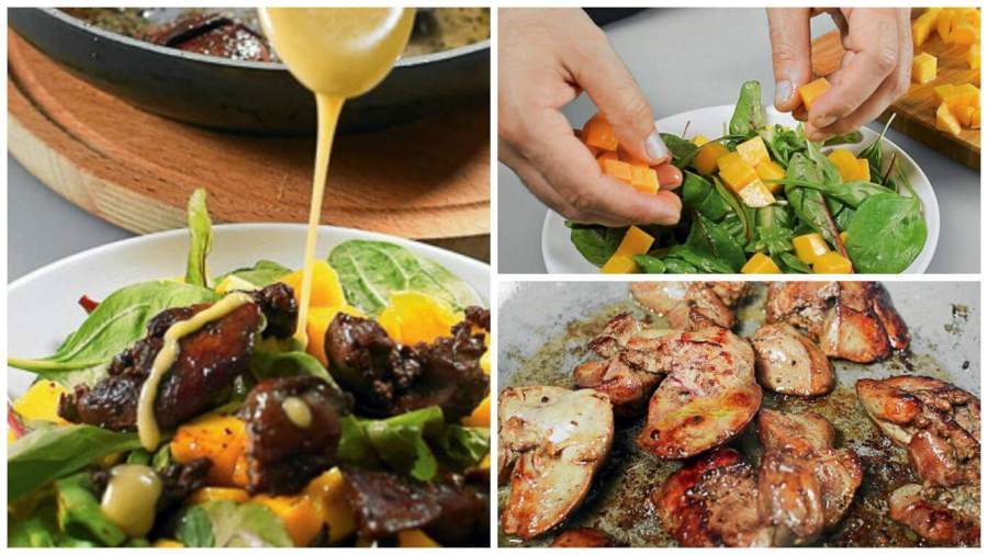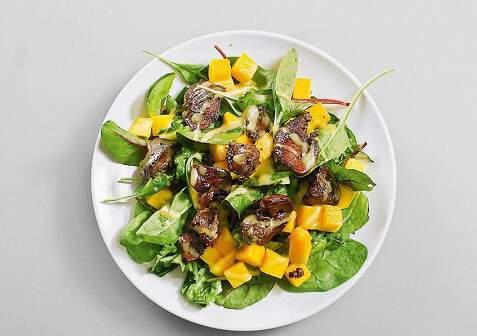 6. Выложите кусочки жареной куриной печени сверху на салат. Щедро полейте салат с куриной печенью и манго горчично-медовой заправкой.