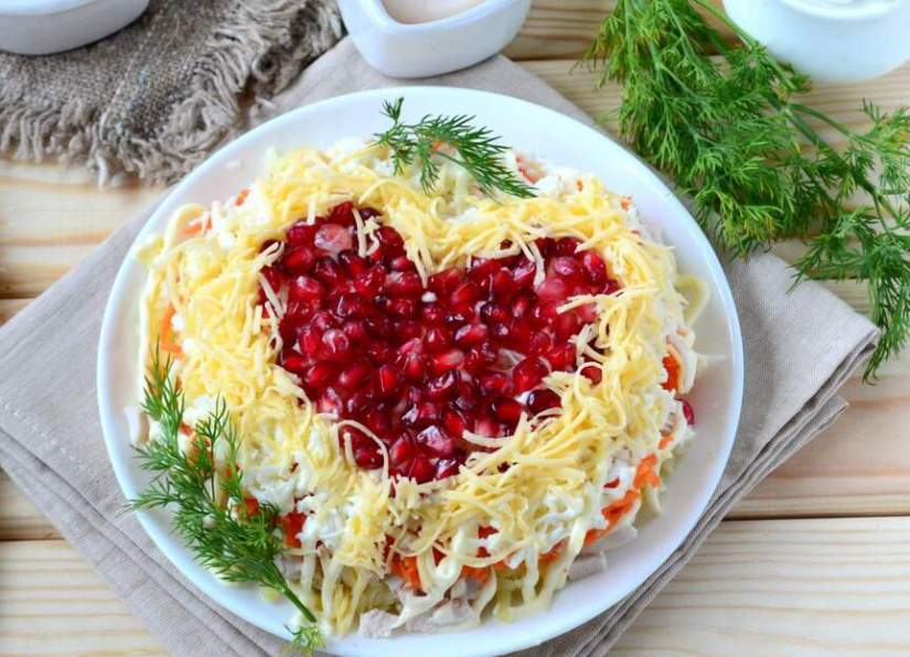 11. Украсьте салат сверху зернами граната, нанесите «окантовку» из тертого сыра, разложите на блюде в живописном порядке веточки укропа или любую другую зелень.