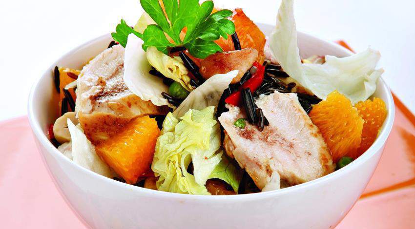 7. Выложите в миску для салата рис, капусту, кусочки жаренной курицы, апельсины и перец.