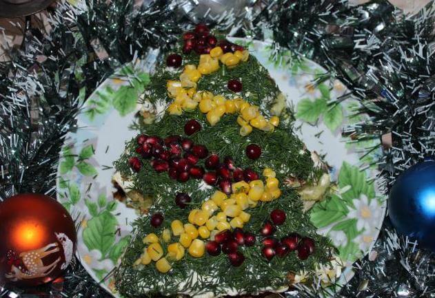 6. Самим верхним слоем выложите мелко нарезанный укроп, который будет изображать хвою нашей ёлочки. Украсьте «ветви» шарами из клюквы, гирляндами из консервированной кукурузы и зерен граната.
