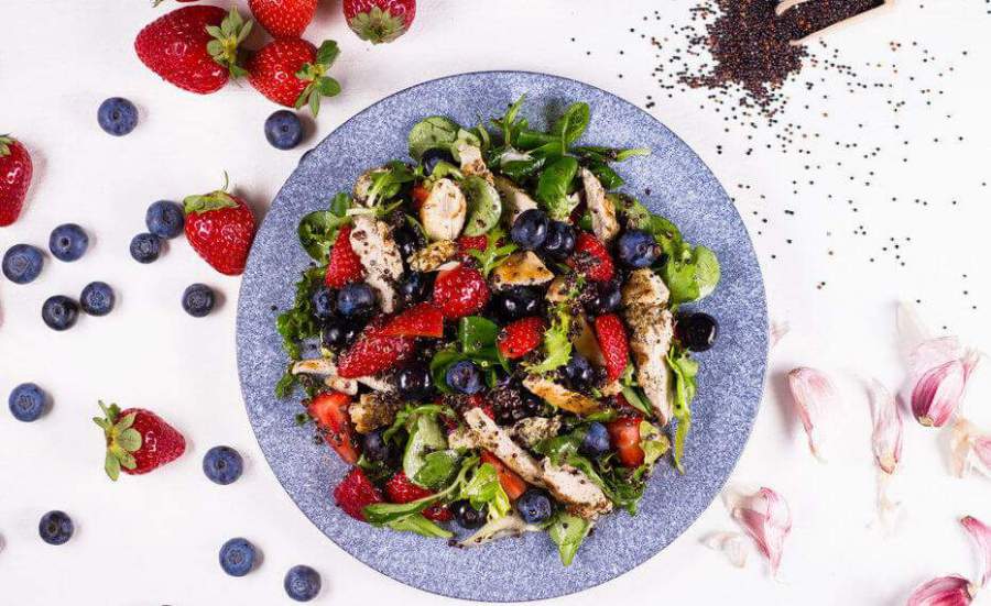 6. В большой миске смешайте кашу киноа с заправкой, добавьте листья салата, нарезанную клубнику и жареную индейку. Выложите все на блюдо и посыпьте ягодами черники.